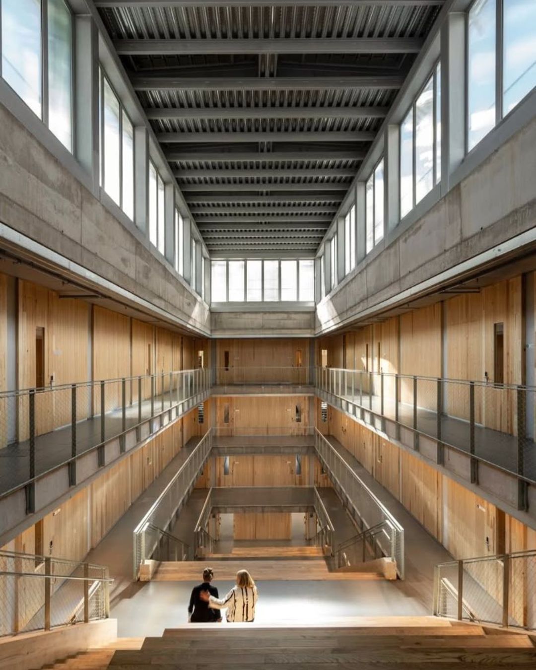 Por último, en la parte central del edificio destaca la presencia de una grada de madera estructural, compuesta de paneles de CLT y elementos de madera laminada encolada GL24h, que va conectando las distintas plantas a través de pasarelas de hormigón en las que se apoya.